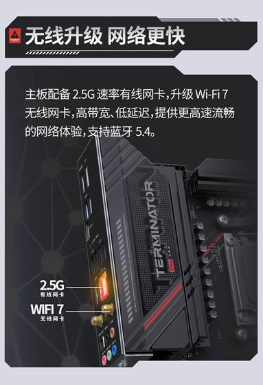 網(wǎng)絡(luò)方面,主板升級到WiFi 7無線網(wǎng)卡,支持藍牙5.4,有線方面則配備 Realtek RTL8125D 2.5G 高速網(wǎng)卡。無論是有線還是無線,都能提供高帶寬、低延遲的網(wǎng)絡(luò)環(huán)境,為在線學(xué)習(xí)、高清直播、高速下載和競技游戲帶來流暢穩(wěn)定的連接體驗。