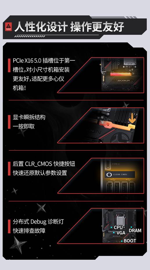 許多在一代產(chǎn)品上備受好評的貼心設(shè)計也延續(xù)到了MS-Terminator B850M PRO II WIFI7,如顯卡瞬拆結(jié)構(gòu)、分布式Debug診斷燈和CLR_CMOS快捷按鈕,讓用戶能有更便捷省心的裝機體驗。