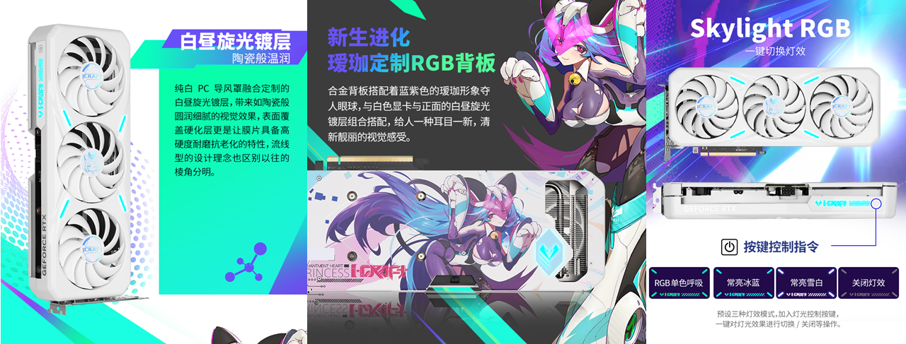 不僅性能能打,這款顯卡的外觀上設(shè)計(jì)清新亮眼,純白PC導(dǎo)風(fēng)罩融合定制白晝旋光鍍層,觸感如陶瓷般圓潤細(xì)膩,定制璦珈合金背板上的藍(lán)紫色璦珈形象靈動(dòng)吸睛,與正面鍍層相得益彰,為主機(jī)增添一抹清新亮眼的格調(diào)。更貼心配備一鍵燈光控制鍵,玩家可隨心切換燈效,讓柔和光影與《天國:拯救 2》的中世紀(jì)復(fù)古風(fēng)格碰撞出獨(dú)特火花,打造專屬電競氛圍。