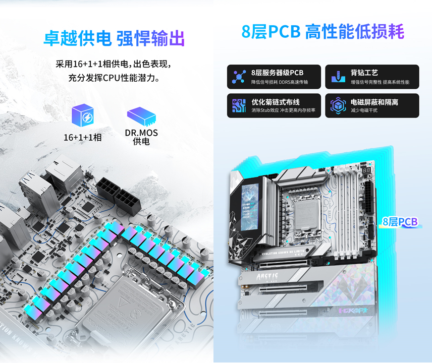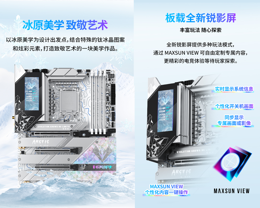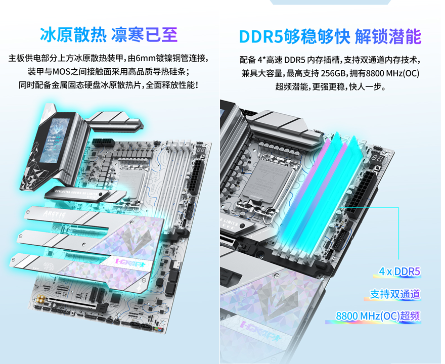 而要讓這顆 “強芯” 充分釋放潛能,離不開一塊實力與顏值兼?zhèn)涞闹靼?—— 銘瑄 iCraft Z890 Arctic 正是這樣的存在。這款主板作為iCraft系列的高端型號,以 “北冰洋” 為設計靈感,采用冰原美學設計。特殊的鈦冰晶圖案搭配炫彩元素,整體色調統(tǒng)一且富有質感,擺在機箱中宛如一件冰雕藝術品,完美適配當下流行的白色主機風格,擺放在機箱中,瞬間提升整機顏值。