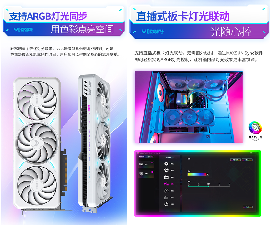 更貼心的是,它支持直插式板卡燈光聯(lián)動,無需額外線材,通過MAXSUN Sync軟件即可實現(xiàn)ARGB燈光控制,在《三角洲》中切換不同場景時,機箱內的燈光也能隨之變化,與游戲場景遙相呼應,沉浸式體驗直接拉滿。