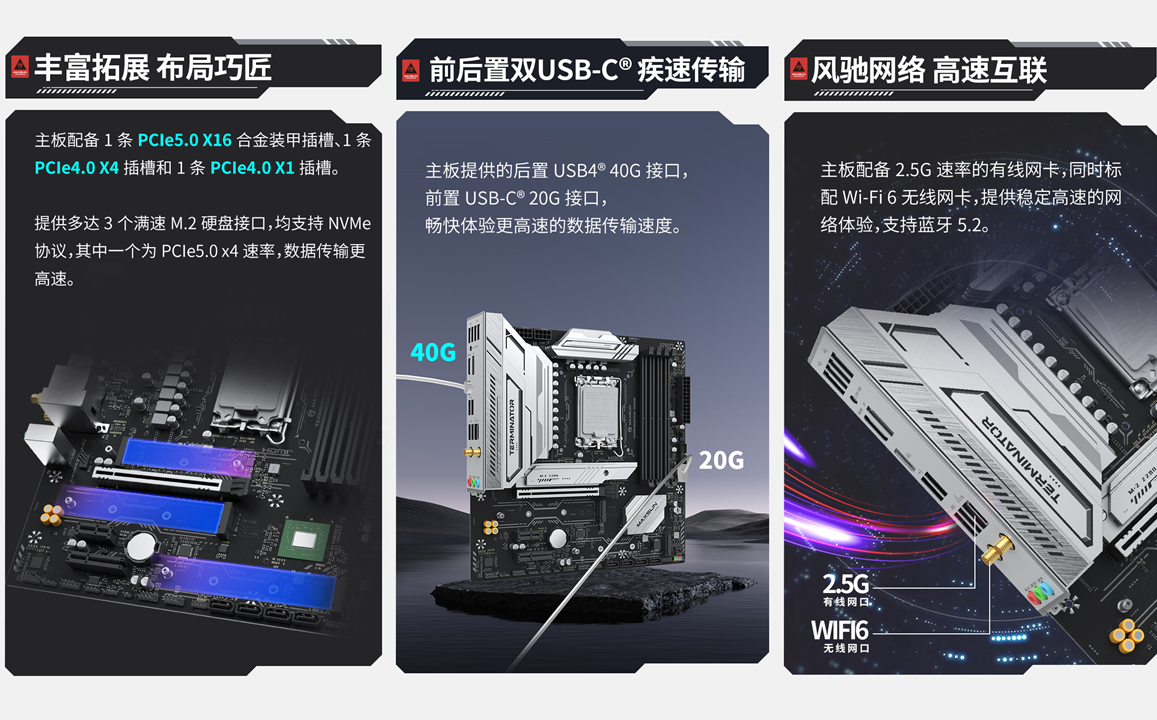拓展性方面,銘瑄Terminator B860M WIFI主板堪稱 “全能選手”, 接口豐富且實用。 它配備 1 條 PCIe5.0 X16 合金裝甲插槽,有效防止因顯卡過重導(dǎo)致的插槽變形,給顯卡穩(wěn)穩(wěn)的支撐;同時還搭載 1 條 PCIe4.0 X4 插槽和 1 條 PCIe4.0 X1 插槽,可靈活連接萬兆網(wǎng)卡、擴展卡等外設(shè)。存儲接口同樣充裕,提供 3 個滿速 M.2 硬盤接口,均支持 NVMe 協(xié)議,其中 1 個更是支持 PCIe5.0 x4 速率,海量存儲輕松擴容,數(shù)據(jù)傳輸高速高效。后置 USB4 40G 接口與前置 USB-C 20G 接口的搭配,讓數(shù)據(jù)傳輸速度再上一個臺階,暢快體驗無需等待。網(wǎng)絡(luò)體驗也不拉胯!主板配備 2.5G 速率有線網(wǎng)卡和 Wi-Fi 6 無線網(wǎng)卡,同時支持藍牙 5.2,有線、無線雙模式自由選擇,無需額外升級。無論是有線連接的穩(wěn)定高速,還是無線連接的便捷靈活,都能有效避免網(wǎng)絡(luò)卡頓和延遲,不管是沉浸式游戲娛樂,還是高效遠程辦公,都能輕松應(yīng)對。