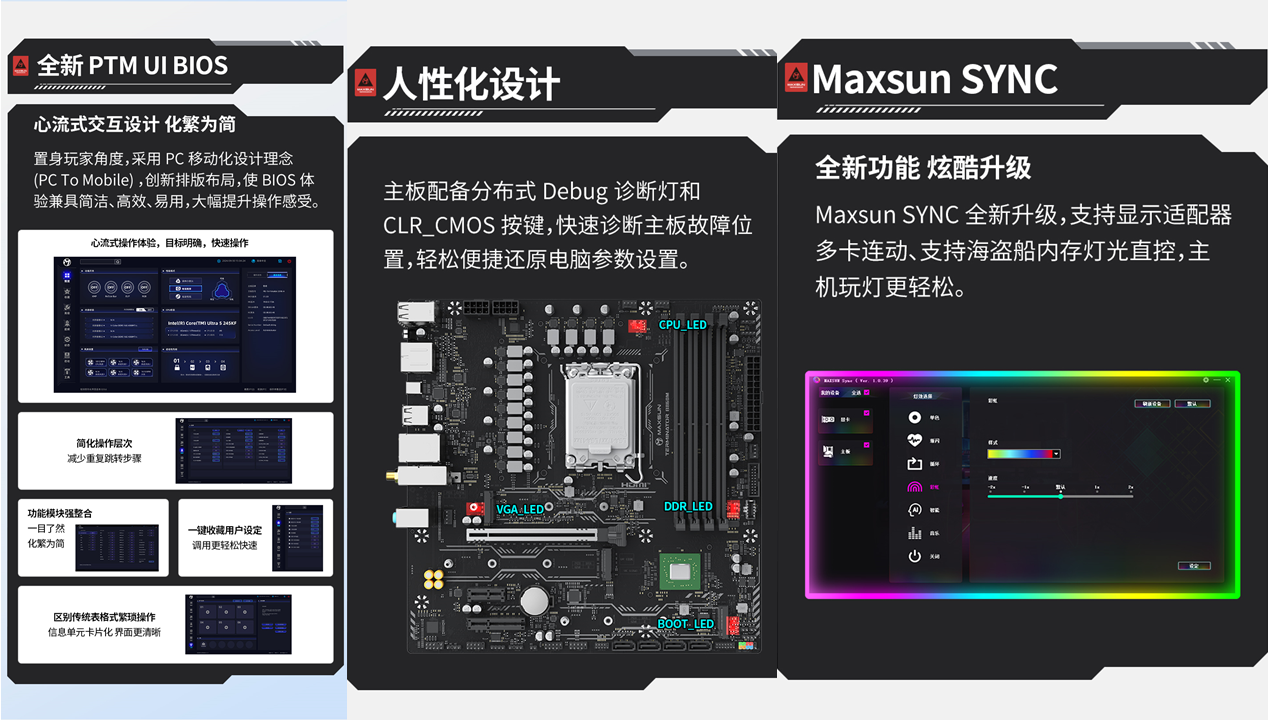 除了硬核配置,這款主板的貼心設(shè)計,更是讓裝機和使用體驗直接拉滿。全新升級的PTM UI BIOS,借鑒手機 APP 的交互邏輯,采用模塊化設(shè)計,交互層級不超過 2 層,手機端風(fēng)格的卡片式界面,讓復(fù)雜的 BIOS 設(shè)置變得簡單易懂,即使是新手玩家也能輕松上手。分布式 Debug 診斷燈和CLR_CMOS 快捷按鈕能快速定位故障,小白也能輕松排查問題,讓裝機全程省心省力,告別復(fù)雜操作。它還支持RGB光效同步,可與顯卡、內(nèi)存等外設(shè)實現(xiàn)燈光聯(lián)動,隨心切換炫酷燈光效果,無論是打造黑色電競主機,還是組裝純白海景房,都能完美適配,輕松打造氛圍感拉滿的裝機效果。