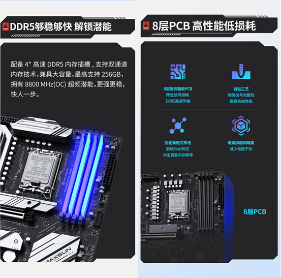 內(nèi)存拓展與性能表現(xiàn)上,這款主板同樣實(shí)力出眾。它配備4*高速DDR5內(nèi)存插槽,支持雙通道內(nèi)存技術(shù),兼具大容量,最高支持256GB,擁有8800 MHz(OC)超頻潛能,更強(qiáng)更穩(wěn)。再加上英特爾酷睿 Ultra 7 265K 處理器對(duì) CUDIMM內(nèi)存的支持,更為沖擊高內(nèi)存頻率提供了可能。對(duì)游戲玩家和追求高性能的用戶來說,高頻內(nèi)存能夠有效提升系統(tǒng)的數(shù)據(jù)讀寫速度,減少游戲加載時(shí)間,提升多任務(wù)處理能力,帶來更流暢的畫面切換和更快的場(chǎng)景加載體驗(yàn)。此外,主板采用 8 層服務(wù)器級(jí) PCB 設(shè)計(jì),配合背鉆工藝和優(yōu)化的菊鏈?zhǔn)讲季,有效降低信號(hào)損耗,增強(qiáng)信號(hào)完整性,消除 Stub 效應(yīng),不僅保障了 DDR5 內(nèi)存的高速穩(wěn)定傳輸,更減少了電磁干擾,為整套平臺(tái)的高性能運(yùn)行奠定了堅(jiān)實(shí)基礎(chǔ)。