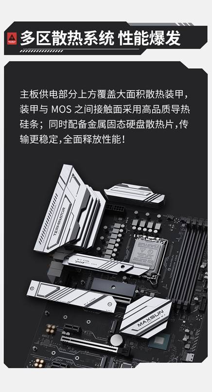 散熱能力是保障硬件長(zhǎng)期穩(wěn)定運(yùn)行的關(guān)鍵,銘瑄 MS-Terminator Z890-A WIFI 主板在散熱設(shè)計(jì)上同樣下足了功夫。主板供電部分上方覆蓋了大面積散熱裝甲,裝甲與 MOS 之間的接觸面采用高品質(zhì)導(dǎo)熱硅條,能夠快速導(dǎo)出供電模塊工作時(shí)產(chǎn)生的熱量;同時(shí),主板還配備了金屬固態(tài)硬盤散熱片,有效降低固態(tài)硬盤在高速傳輸數(shù)據(jù)時(shí)的溫度,確保其傳輸穩(wěn)定性,全面釋放存儲(chǔ)性能。在這套強(qiáng)悍的多區(qū)散熱系統(tǒng)加持下,即便英特爾酷睿 Ultra 7 265K 處理器長(zhǎng)時(shí)間高負(fù)載運(yùn)行,主板也能保持較低溫度,避免因過熱導(dǎo)致的性能降頻,讓玩家在長(zhǎng)時(shí)間鏖戰(zhàn)游戲或進(jìn)行專業(yè)創(chuàng)作時(shí)無后顧之憂。