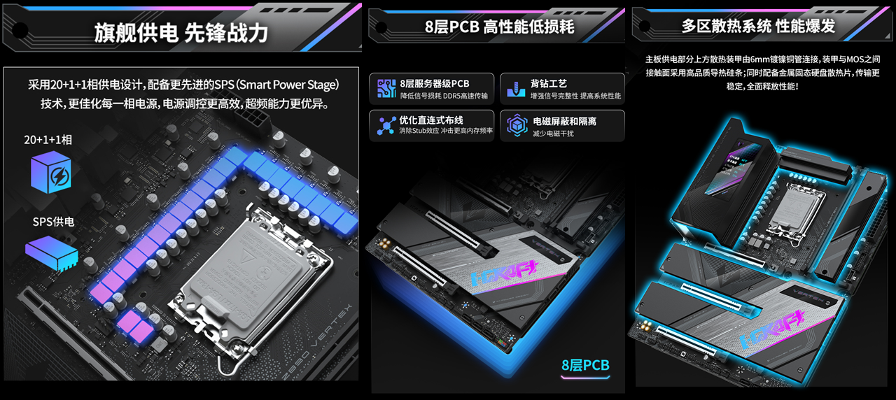 作為銘瑄 iCraft 系列的旗艦力作,銘瑄iCraft Z890 Vertex(珠峰)主板像是整套硬件的 “性能中樞”,搭載20+1+1相SPS供電設(shè)計,搭配8層服務(wù)器級PCB,實現(xiàn)高性能低損耗,能充分釋放英特爾酷睿Ultra 9 285K處理器的澎湃性能,即便長時間高負(fù)載運行也能穩(wěn)定輸出,為顯卡發(fā)揮強悍性能筑牢基礎(chǔ)。散熱配置更是拉滿,供電部分的散熱裝甲由6mm鍍鎳銅管連接,裝甲與MOS之間貼合高品質(zhì)導(dǎo)熱硅條,加上金屬固態(tài)硬盤散熱片,全面保障硬件冷靜運行,避免長時間高負(fù)載游戲中的掉幀卡頓問題。