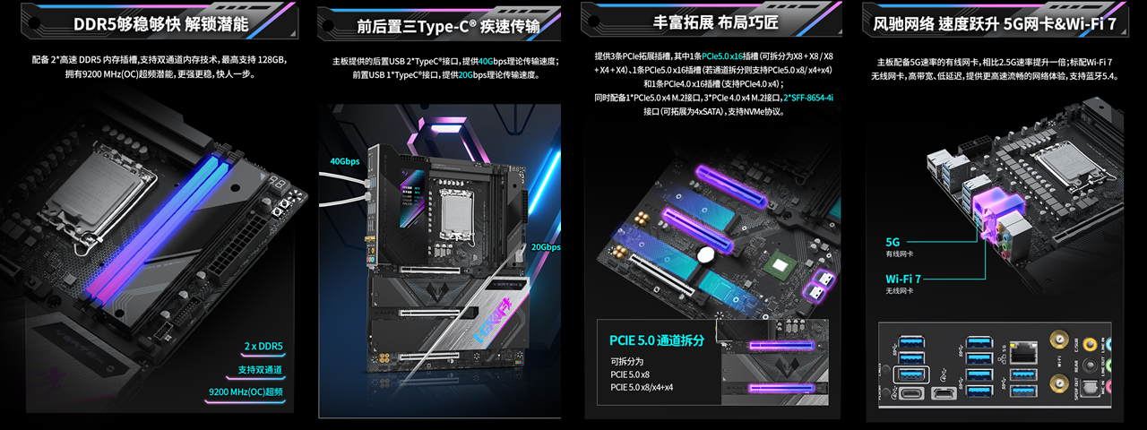 在拓展與體驗上,這款主板也是誠意滿滿。配備2 條高速 DDR5 內(nèi)存插槽,支持雙通道技術(shù)與最高 128GB 容量,更擁有9200MHz(OC)超頻潛能,搭配CUDIMM內(nèi)存可輕松突破頻率上限,大幅提升新游紋理加載速度,告別畫面延遲;3 條 PCIe 拓展插槽搭配多規(guī)格 M.2 接口,完美兼容大容量高速固態(tài)硬盤與多硬盤存儲陣列,再多新游也能 “盡收囊中”;Intel BE200 Wi-Fi7 無線網(wǎng)卡 + 5G 速率有線網(wǎng)卡,配合藍(lán)牙 5.4,讓聯(lián)機玩《惡煞車手》時告別網(wǎng)絡(luò)延遲,再也不會因網(wǎng)絡(luò)波動錯失戰(zhàn)機。