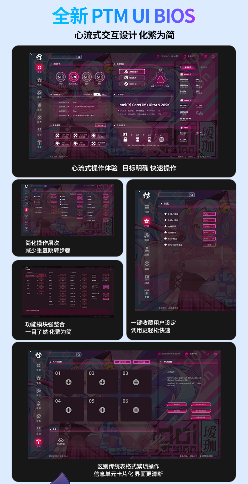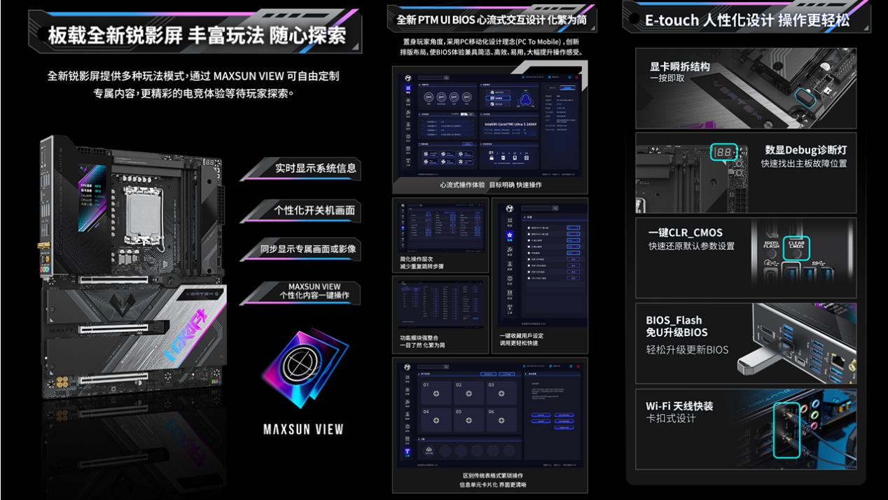 更貼心的是,板載的全新銳影 LED 屏就像硬件的 “智能儀表盤”,實時顯示 CPU 溫度、內(nèi)存頻率等核心參數(shù),無需切換軟件就能掌握硬件狀態(tài),顏值與實用性雙在線;升級的 PTM UI BIOS 采用心流式交互設(shè)計,裝機新手也能輕松上手,數(shù)顯 Debug 診斷燈、一鍵 CLR_CMOS 等設(shè)計,讓硬件調(diào)試全程省心。