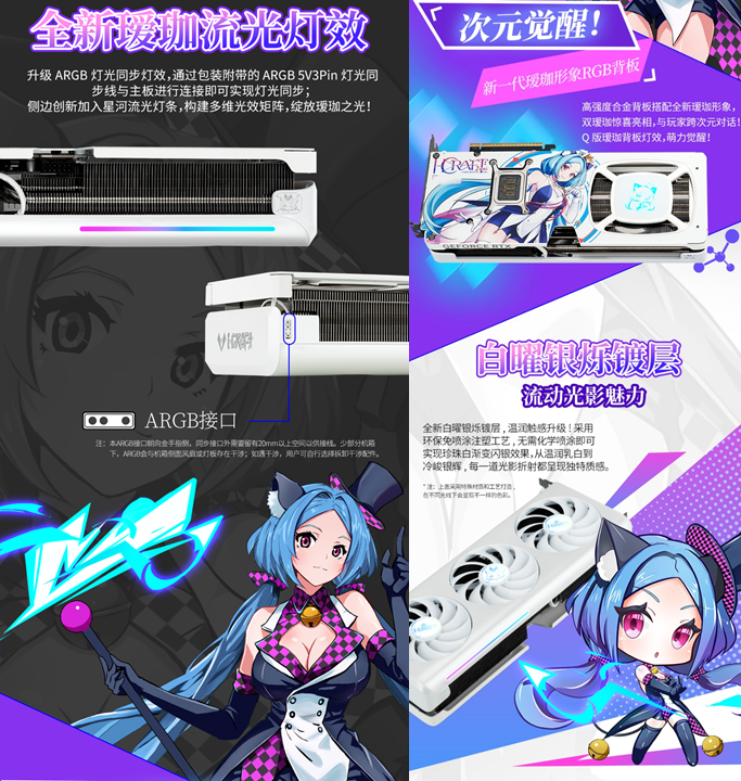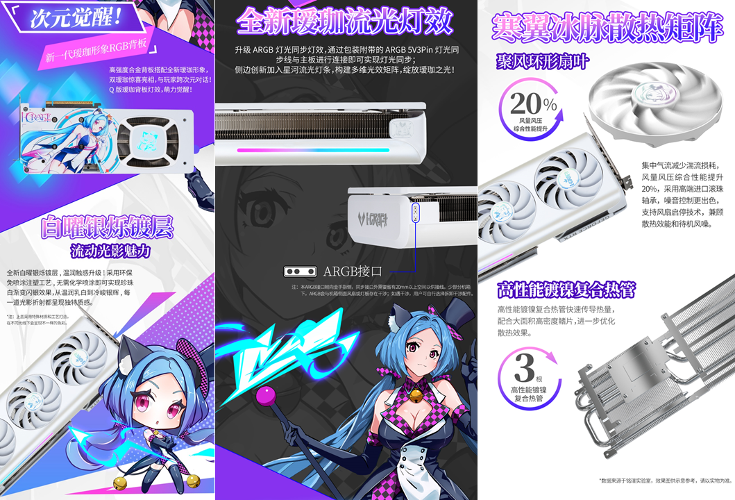 這款顯卡不僅性能硬核,顏值更是戳中二次元玩家的心。升級后的白曜銀爍鍍層搭配億萬納米光刻星光紋理,環(huán)保注塑工藝打造出珍珠白漸變閃銀效果,光線流轉(zhuǎn)間,璀璨的光影軌跡在顯卡表面流動,觸感溫潤又高級;一體環(huán)抱式中框讓線條更流暢,側(cè)邊的星河流光燈條搭配璦珈 RGB 合金背板,構(gòu)建出多維光效矩陣,每一縷光影都透著專屬的二次元氛圍,支持 ARGB 燈光同步后,更是讓顯卡成為個性化主機的顏值擔(dān)當(dāng)。