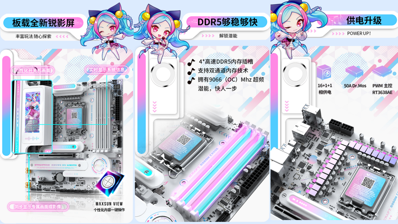 銘瑄iCraft B860M CROSS PRO璦珈主板,是顏值與性能兼具的 “實力選手”。 它采用 16+1+1 相供電設(shè)計,核心供電 50A Dr.Mos,能輕松駕馭英特爾酷睿 Ultra 9 285K 處理器,為 2K 游戲提供穩(wěn)定的性能支撐;4 條高速 DDR5 內(nèi)存插槽支持雙通道技術(shù),擁有 9066MHz(OC)超頻潛能,搭配 CUDIMM 內(nèi)存可突破頻率上限,大幅提升新游紋理加載速度,讓游戲畫面更流暢。顏值與體驗上,這款主板的 3.4 英寸銳影 LED 屏堪稱吸睛亮點,不僅能實時顯示系統(tǒng)信息、自定義個性化開關(guān)機畫面,還能開啟桌面映射,同步顯示專屬畫面或影像,通過 MAXSUN View 軟件可解鎖無限自定義玩法,讓主機更有專屬感;全面支持的 PTM UI BIOS,操作簡潔高效,新手也能輕松上手。