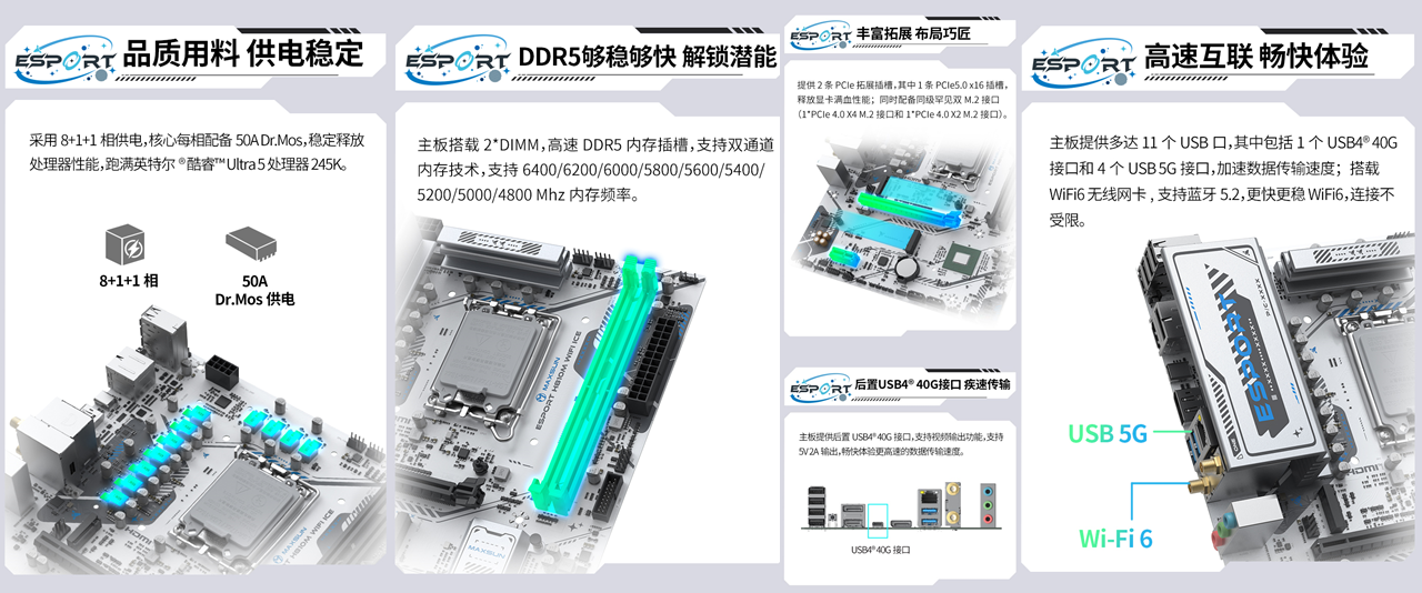 銘瑄eSport H810M WIFI ICE主板,雖定位入門,但顏值性能毫不縮水。它配備8+1+1相50A Dr.Mos供電,高效穩(wěn)定,能夠充分滿足英特爾酷睿 Ultra 5 230F處理器的運行需求,即使是即便長時間高負(fù)載激戰(zhàn),也能保持穩(wěn)定流暢;配備2條高速DDR5內(nèi)存插槽+ 雙 PCIe4.0 M.2 接口,拓展能力在入門主板中堪稱亮眼,滿足日常游戲與存儲需求;冰雪白的主題外觀,顏值出眾,輕松打造個性化桌面主機;后置 USB4 40G 接口搭配多個 USB5G 接口,數(shù)據(jù)傳輸高速又便捷;Wi-Fi6 無線網(wǎng)卡 + 藍(lán)牙 5.2,連接穩(wěn)定,滿足日常上網(wǎng)與聯(lián)機需求;1 條 PCIe5.0 x16 插槽能釋放顯卡的滿血性能,讓 1080P 游戲體驗更絲滑。