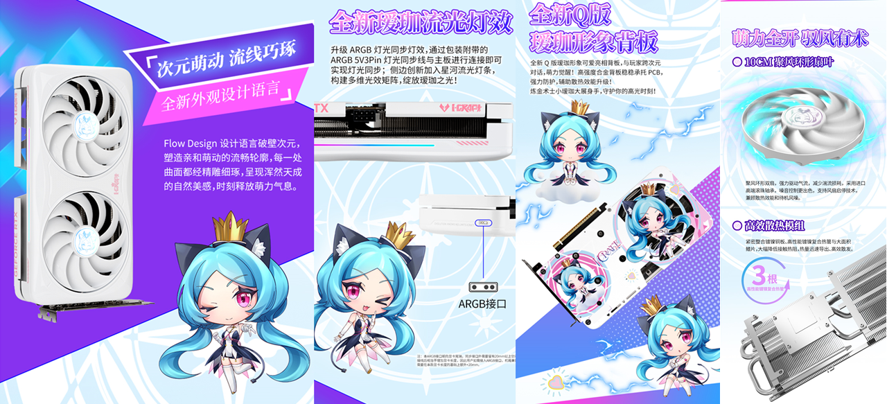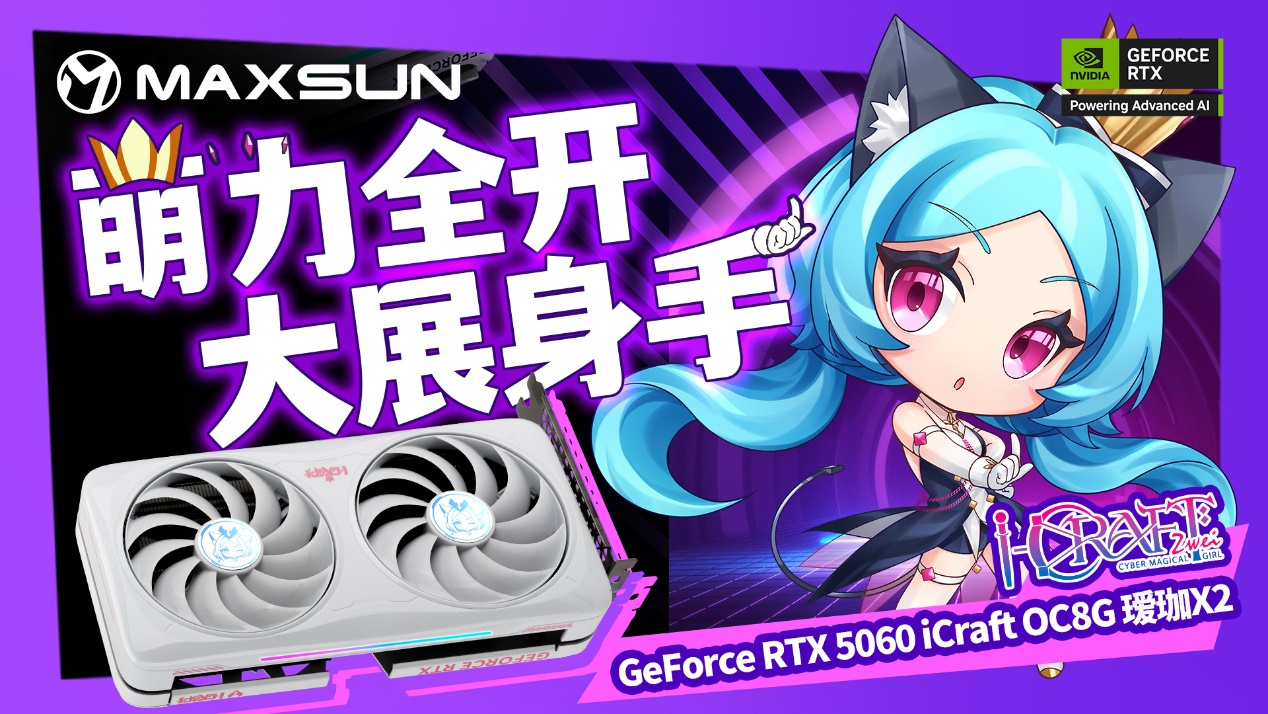 銘瑄GeForce RTX 5060 iCraft OC8G璦珈 X2 顯卡延續(xù)溫潤白色外觀,IP視覺升級,全新 Q 版璦珈形象亮相背板,萌力十足,側(cè)邊的星河流光燈條搭配 ARGB 燈光同步,讓主機顏值再上一個臺階;散熱方面,10CM 聚風(fēng)環(huán)形扇葉集中氣流、減少損耗,進(jìn)口高端滾珠軸承控制噪音,風(fēng)扇啟停技術(shù)兼顧散熱與靜音,高性能鍍鎳復(fù)合熱管與大面積鰭片,讓熱量快速導(dǎo)出。更貼心的是,這款顯卡只需 550W 電源就能支撐整機穩(wěn)定運行,無需額外升級電源,進(jìn)一步降低裝機成本,讓入門玩家以高性價比解鎖游戲快樂。