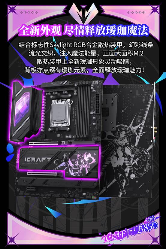 銘瑄iCraft B850 AIGA主板在設(shè)計(jì)上富有巧思,將二次元美學(xué)與硬核硬件完美融合,標(biāo)志性的“璦珈”IP元素貫穿始終,自帶超高視覺辨識度,戳中年輕學(xué)生黨的審美偏好。標(biāo)志性的 Skylight RGB 合金散熱裝甲,凌厲的金屬質(zhì)感之上,幻彩 RGB 線條如流光般交織流轉(zhuǎn),仿佛注入了靈動的魔法能量,隨呼吸燈效變幻出萬千色彩,為機(jī)箱內(nèi)部營造出沉浸感的光影氛圍。主板正面大面積的 M.2 散熱裝甲上,全新設(shè)計(jì)的璦珈形象靈動吸睛,背板處也巧妙點(diǎn)綴著同款元素,從正面到背面,每一處細(xì)節(jié)都在釋放獨(dú)特的 “璦珈魔法”,讓二次元愛好者一眼淪陷。