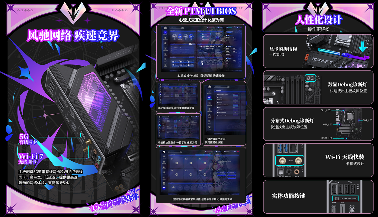 網(wǎng)絡(luò)體驗(yàn)與操作便捷性上這款主板也毫不遜色。5G 速率有線網(wǎng)卡與 Wi-Fi 7 無線網(wǎng)卡的雙旗艦配置,搭配藍(lán)牙 5.4,無論是在宿舍連接校園無線網(wǎng)絡(luò),還是接入有線寬帶,都能實(shí)現(xiàn)高帶寬、低延遲的網(wǎng)絡(luò)傳輸,在線游戲?qū)?zhàn)時告別卡頓掉線,線上聽課、高清視頻會議、大型文件下載時流暢無阻。全新升級的 PTM UI BIOS 更是一大亮點(diǎn),借鑒手機(jī) APP 交互邏輯,將功能模塊化且交互層級精簡至 2 層以內(nèi),還特別加入璦珈魔術(shù)師形象,新手也能輕松完成 BIOS 調(diào)試;顯卡瞬拆結(jié)構(gòu)、Wi-Fi 天線快裝、數(shù)顯 Debug 診斷燈等 E-touch 人性化設(shè)計(jì),讓裝機(jī)和調(diào)試過程告別繁瑣,省心又高效,小白也能輕松上手。