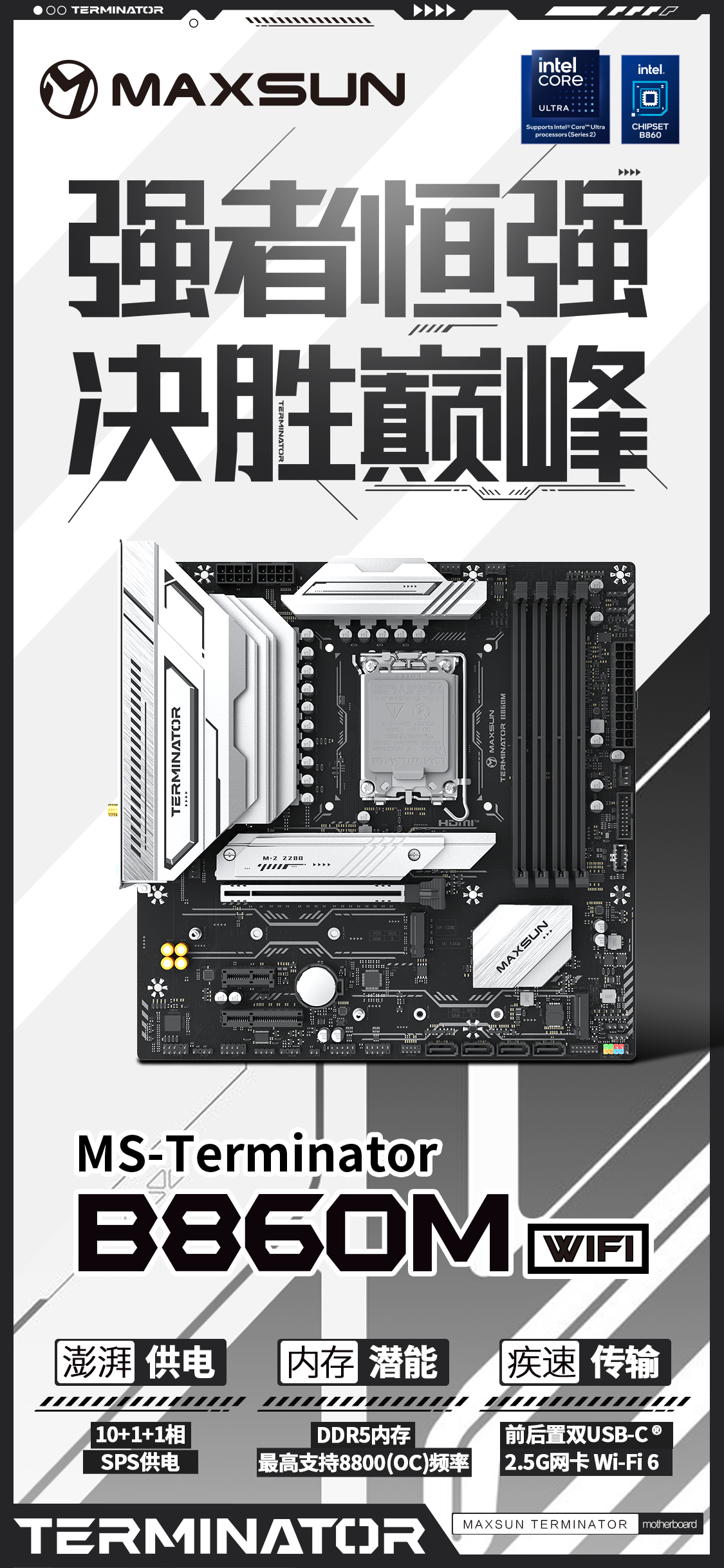 MS-Terminator B860M WIFI是銘瑄終結(jié)者系列的主流爆款,采用Micro-ATX板型,外觀上延續(xù)了終結(jié)者系列的經(jīng)典撞色設(shè)計,黑色PCB搭配銀白色散熱裝甲,低調(diào)中透著科技感。供電部分覆蓋大面積散熱裝甲,裝甲與MOS之間采用高品質(zhì)導(dǎo)熱硅條,快速傳導(dǎo)熱量,確保供電穩(wěn)定。供電方面,其采用10+1+1相SPS供電設(shè)計,配備SPS智能供電技術(shù),電源調(diào)控高效穩(wěn)定,可充分釋放處理器的性能,即便處理器滿負(fù)載運行,也能避免卡頓、掉幀問題,內(nèi)存方面,配備4條DDR5內(nèi)存插槽,支持雙通道技術(shù),最高支持192GB容量,擁有8800 MHz(OC)超頻潛能,更強(qiáng)更穩(wěn)。搭配新處理器的內(nèi)存優(yōu)化,大幅提升系統(tǒng)讀寫速度與多任務(wù)處理能力。