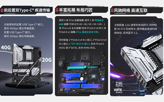 在拓展性方面,該主板展現(xiàn)出了強(qiáng)大的兼容性和實(shí)用性,能夠滿足玩家多樣化的硬件拓展需求。主板提供 4 條 PCle 拓展插槽,其中 1 條 PCle5.0 x16 插槽(可拆分為 X8+X8/X8+X4+X4)、1 條 PCle x16 全長插槽(支持 PCle4.0 x4)和 2 條 PCle4.0 x1 插槽,全板 PCle 通道無沖突。存儲接口方面,主板配備 1 個 PCle5.0 x4 M.2 接口、3 個 PCle4.0 x4 M.2 接口以及 1 個 SFF-8654 4i 接口(支持 PCle4.0 X4/X2 或 4*SATA),且均支持 NVMe 協(xié)議。此外,主板還配備前后置雙 Type-C 接口,后置 USB Type-C 接口理論傳輸速度可達(dá) 40Gbps,前置 USB Type-C 接口理論傳輸速度為 20Gbps,輕松實(shí)現(xiàn)疾速傳輸,滿足玩家的高效數(shù)據(jù)交互需求。網(wǎng)絡(luò)體驗(yàn)也不拉胯,主板配備 2.5G 速率有線網(wǎng)卡和 Wi-Fi 6 無線網(wǎng)卡,同時支持藍(lán)牙 5.2,有線、無線雙模式自由選擇,無需額外升級。不管是游戲?qū)?zhàn)時的低延遲需求,還是遠(yuǎn)程辦公的穩(wěn)定連接要求,都能輕松應(yīng)對。