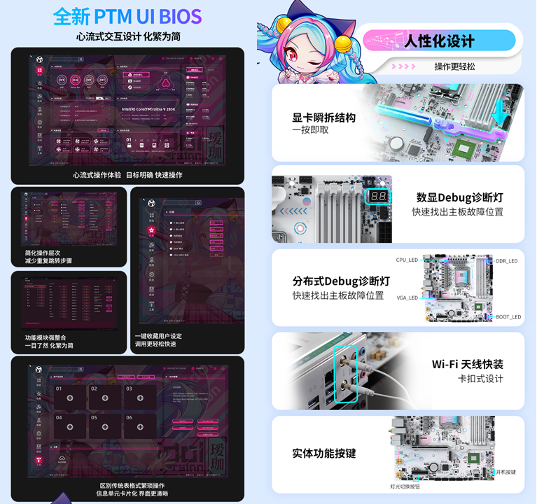 除了強悍的性能與豐富的功能,銘瑄 iCraft B860M CROSS PRO主板在操作便捷性和個性化打造上,也格外貼心,全方位提升用戶的使用與裝機體驗。全新升級的 PTM UI BIOS,借鑒了手機 APP 的交互邏輯,采用模塊化設計,交互層級不超過 2 層,卡片式的界面一目了然,就算是裝機新手,也能輕松搞定 BIOS 設置。同時主板配備顯卡瞬拆結構和 Wi-Fi天線快裝設計,無需繁瑣操作,讓裝機、硬件升級更便捷;數(shù)顯+分布式 Debug 診斷燈能一眼識別故障位置,省去繁瑣排查步驟,讓玩家專注享受裝機與游戲的樂趣。