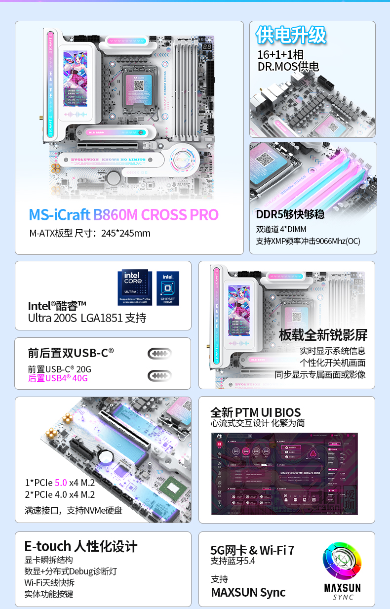 銘瑄 iCraft B860M CROSS PRO主板將次元美學與旗艦性能完美融合,全覆蓋藍粉漸變二次元紋路,3.4 英寸銳影 LED 顯示屏為核心亮點,支持自定義開關(guān)機畫面、桌面映射,搭配 MAXSUN View 軟件可解鎖無限個性化玩法,成為主機的 “個性門面”。供電采用 16+1+1 相 50A Dr.MOS 組合搭配 RT3638AE PWM 芯片,為新處理器提供澎湃且穩(wěn)定的電力輸出,高負載下依舊平穩(wěn)。4 條 DDR5 插槽擁有 9066(OC)MHz 的超頻潛能,完美兼容新處理器原生的 DDR5-7200 MT/s 內(nèi)存,專業(yè) PCB 優(yōu)化布線有效降低高頻信號損耗與串擾。拓展上配備 PCIe5.0 X16 合金裝甲插槽 + 3 個滿速 M.2 接口,滿足高端顯卡與高速存儲拓展需求;網(wǎng)絡(luò)同樣搭載 Wi-Fi 7+5G 有線的雙高速組合,搭配藍牙 5.4,保障全場景網(wǎng)絡(luò)體驗。此外,顯卡瞬拆、Wi-Fi 天線快裝設(shè)計,讓裝機與硬件升級更便捷。