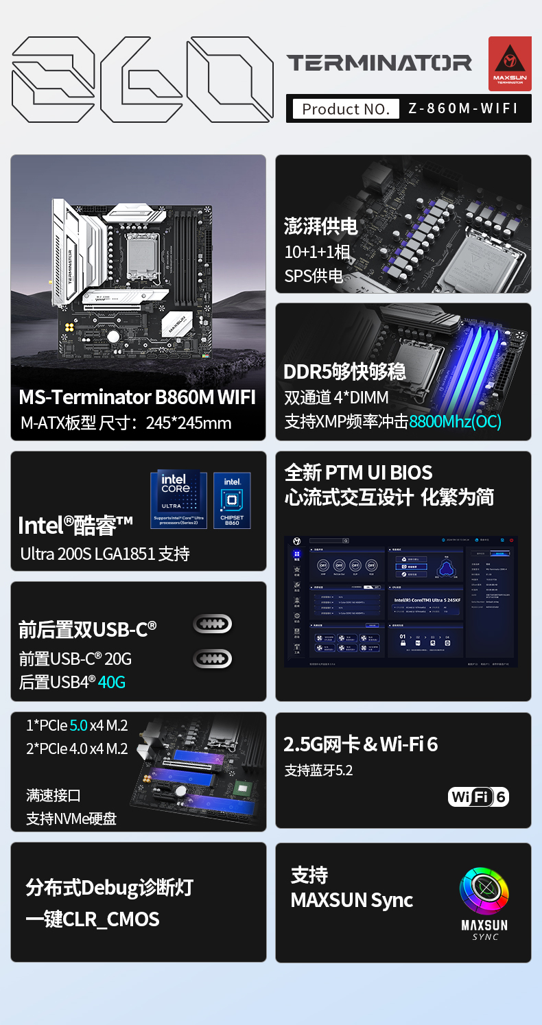 銘瑄 Terminator B860M WIFI主板采用 Micro-ATX 的板型,延續(xù)終結(jié)者系列經(jīng)典黑銀撞色設(shè)計,低調(diào)中盡顯科技感,是入門裝機、設(shè)備升級的高性價比之選。供電采用 10+1+1 相 SPS 設(shè)計,搭配大面積散熱裝甲與高品質(zhì)導熱硅條,為新處理器提供持續(xù)平穩(wěn)的電力輸出,滿負載下無卡頓掉幀問題。4 條 DDR5 插槽支持 192GB 大容量與 8800MHz 超頻潛能,配合新處理器對 CUDIMM 內(nèi)存的支持,大幅提升系統(tǒng)數(shù)據(jù)讀寫與多任務(wù)處理能力。拓展性表現(xiàn)亮眼,PCIe5.0 X16 合金裝甲插槽為顯卡提供穩(wěn)固支撐,3 個滿速 M.2 接口(含 1 個 PCIe5.0 x4)+ 多規(guī)格 PCIe 插槽,滿足硬件拓展與海量存儲需求;前后置雙高速 Type-C 接口實現(xiàn)疾速數(shù)據(jù)傳輸。網(wǎng)絡(luò)上配備 2.5G 有線 + Wi-Fi 6 無線網(wǎng)卡,搭配藍牙 5.2,有效避免網(wǎng)絡(luò)卡頓延遲,適配游戲、辦公、娛樂等多場景使用。