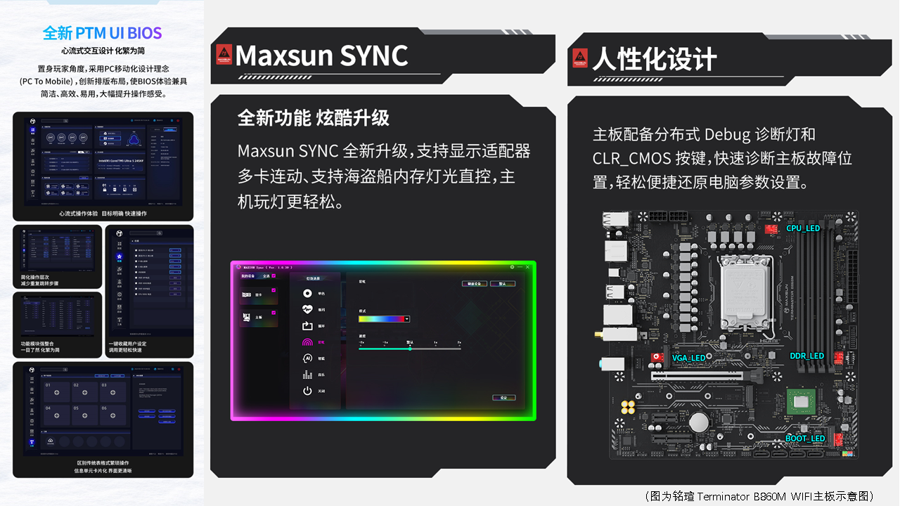 除了各有特色的硬核規(guī)格,銘瑄這四款主板均搭載全新 PTM UI BIOS,模塊化設(shè)計讓交互層級不超 2 層,新手也能輕松操作;同時配備分布式 Debug 診斷燈、CLR_CMOS 快捷按鈕,故障排查更省心,還支持 RGB 光效同步,可與外設(shè)聯(lián)動打造個性化裝機氛圍,從操作便捷性到個性化設(shè)計實現(xiàn)全方位體驗升級。